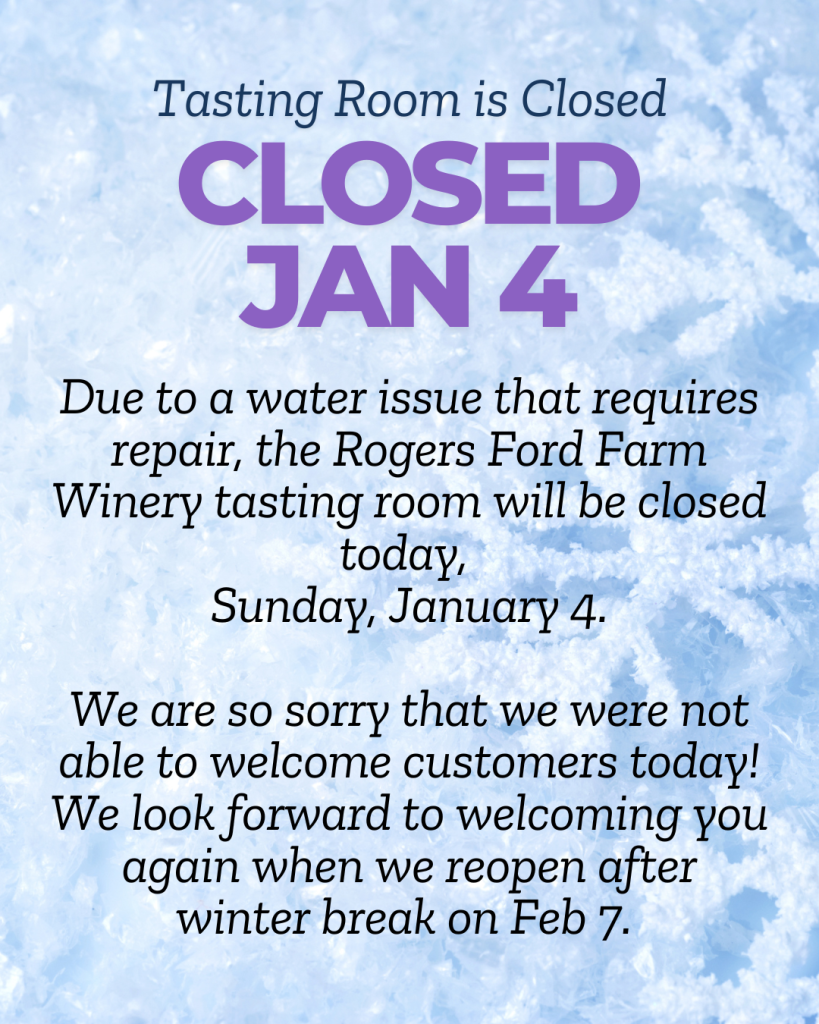 Unfortunately, due to a water issue that requires repair, the tasting room is closed on Sunday, Jan 4.